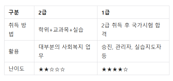 - 역할: 사회복지 분야의 기본적인 자격으로, 대부분의 사회복지사 커리어는 여기서 시작해요