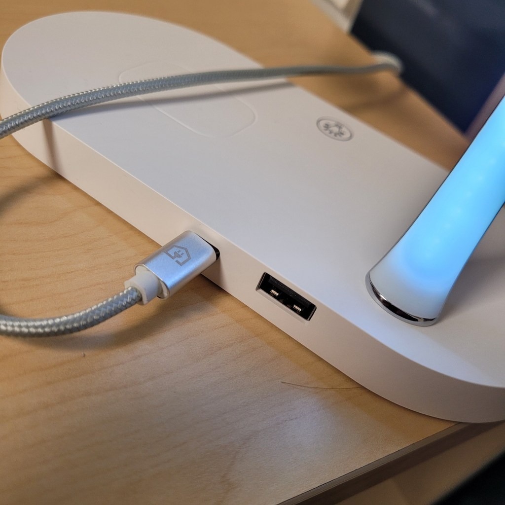 충전기와 함께 제공되는 USB-C 타입 케이블 길이가 약 1m 정도인데, 제 침대 배치상 콘센트까지 연결하기에는 살짝 짧았어요. 결국 집에 있던 더 긴 케이블로 교체해서 사용하고 있습니다. 짧은 케이블로 충분한 환경이라면 상관없겠지만, 공간에 따라 추가 케이블 구매가 필요할 수도 있습니다.